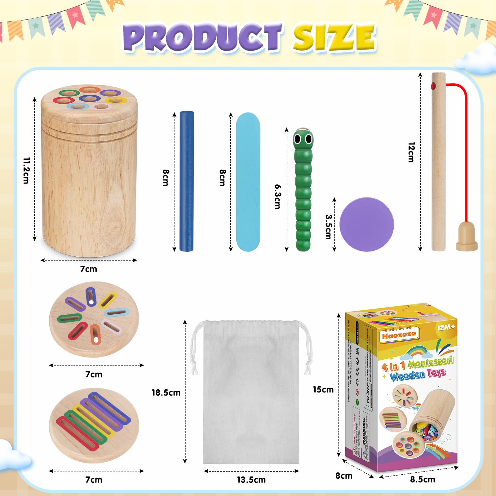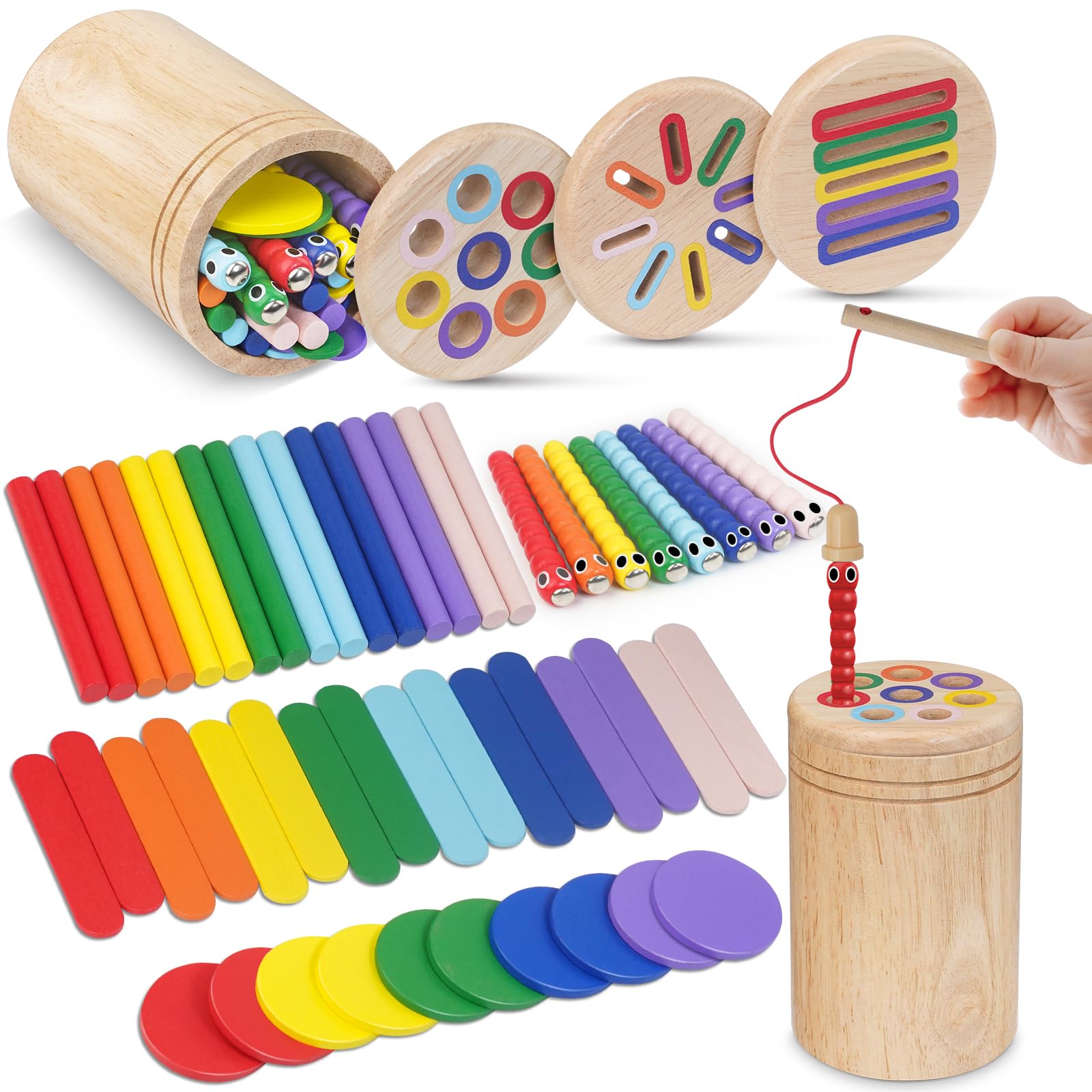 - Lernen und Entwicklung Kleinkindspielzeug: Eine hölzerne Röhre mit 3 Arten von Deckeln, 16 bunten Stöcken, 16 Eisstielen, 10 Scheiben, 8 lange Würmer und eine Angelrute bilden ein klassisches Geschenkpaket für die frühe Bildung. Es fördert die Farbwahrnehmung, das räumliche Vorstellungsvermögen, die Vorstellungskraft und die Innovationskraft des Babys und hilft bei der Kontrolle feiner Bewegungen und des Richtungssinns. Der zu öffnende Deckel hilft Babys, die Objektbeständigkeit und Ursache-Wirkungs-Beziehungen zu verstehen.