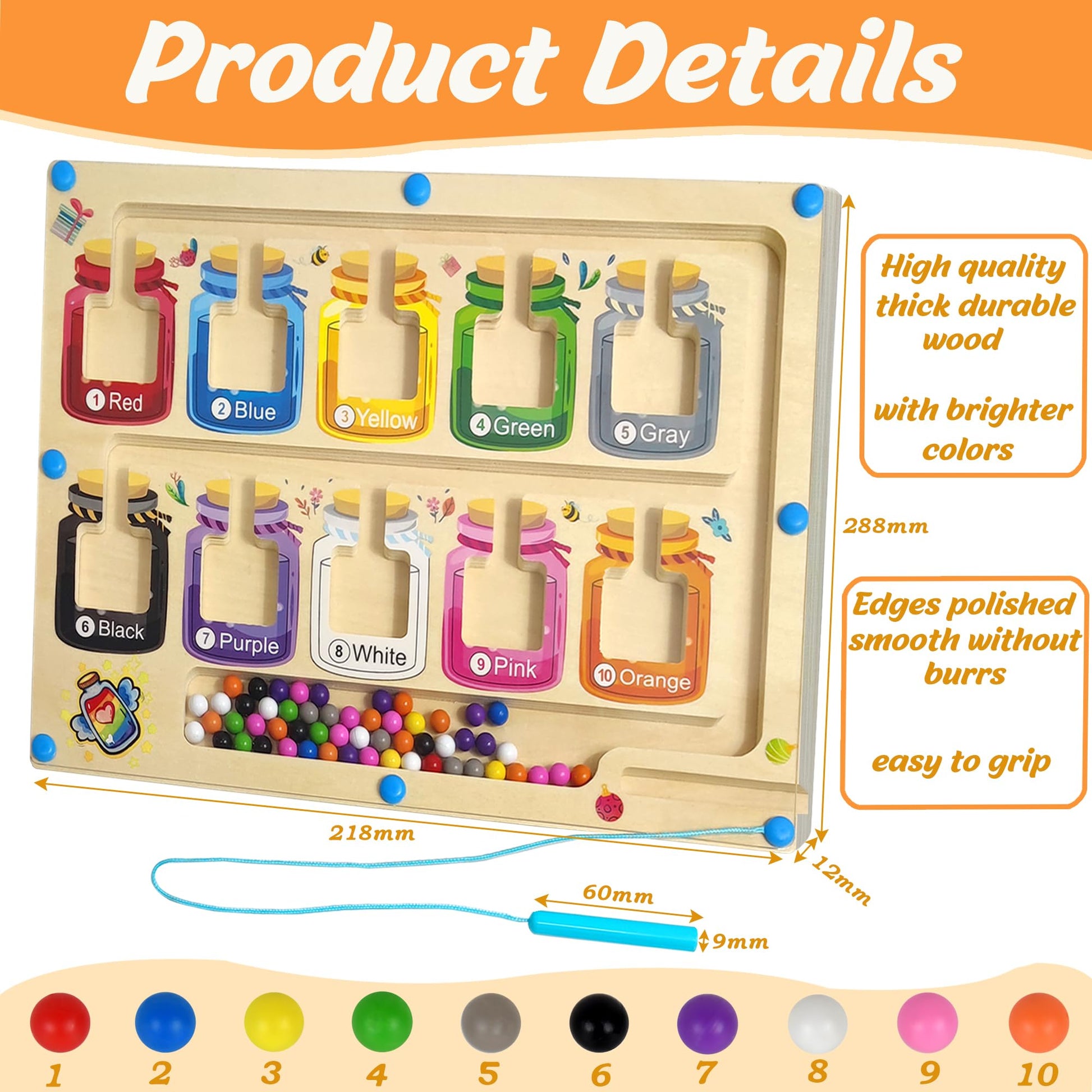 - Spaßiges Montessori-Spielzeug: Dieses Montessori-Magnetlabyrinth kombiniert ein wunderschönes Bonbon-Design. Kinder können mit dem Magnetstift die Magnetkugeln in den entsprechenden Farben und Zahlen in die passenden Bonbongläser bewegen. Beim Spielen lernen die Kinder Farben zu erkennen, Zahlen zu sortieren und zu zählen, und verbessern ihre Hand-Auge-Koordination sowie Feinmotorik.